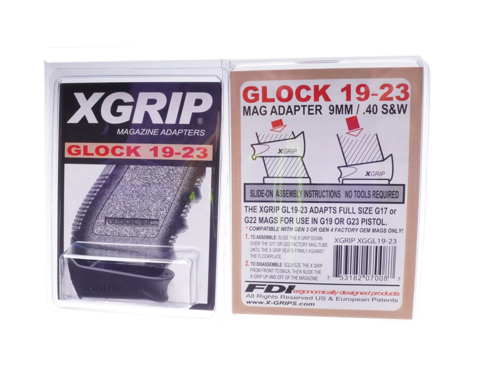 The newly patented XGRIP XGGL26-27C adapts the G19, G23 or G32 compact magazines for use in the G26, G27 or G33 pistols, incorporating the larger magazine into the subcompact grip, and increasing the gun’s capacity. Law enforcement and military personnel can carry the Glock 26, 27 or 33 with a standard magazine when concealment is important, then insert the compact higher capacity magazine with XGRIP when maximum firepower and capacity become critical.